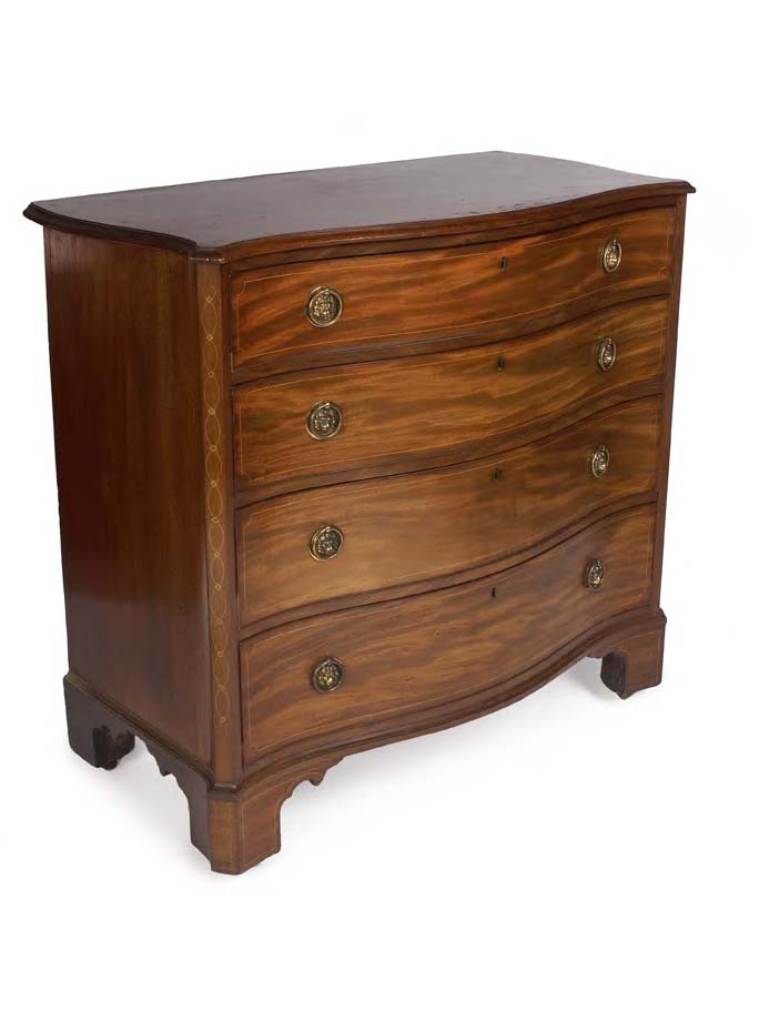 the shaped top with moulded edge above four long drawers, each with boxwood stringing, raised on bracket feet