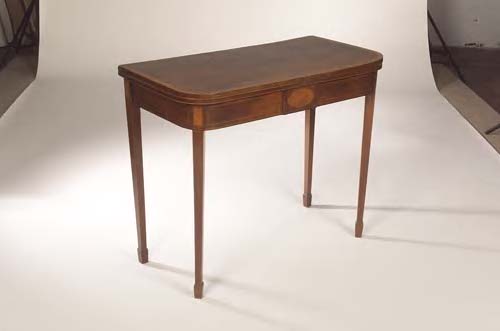 the rectangular hinged top enclosing a baize-lined interior above boxwood inlaid entablature frieze on square tapered legs with spade feet
