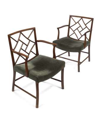 to match the previous lot, each with lattice backs enclosing open arms above overstuffed concave seats, on outswept legs joined by stretchers (2)