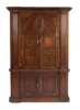 the projecting cornice with Greek key frieze above arched and panelled twin-doors enclosing shelves and flanked by fluted pilasters, the base with twin panelled doors raised on a plinth