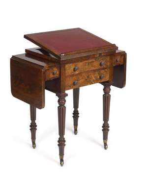 the rectangular hinged top with inset leather writing surface and book rest, enclosing an adjustable ratchet support, raised above two drawers, the lower drawer fitted with silk lined compartments for sewing equipment and containing miscellaneous implements for sewing, the sides with drop flaps and small drawer, the whole raised on turned and reeded legs, with brass caps and castors