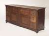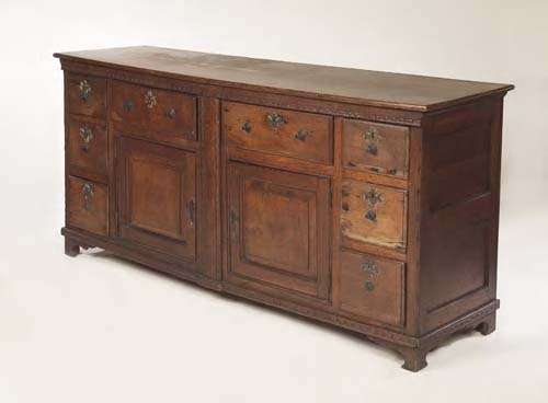 the rectangular top above two drawers with panelled doors, flanked by two banks of three short drawers, the whole enclosed by chip carved frieze and raised on bracket feet