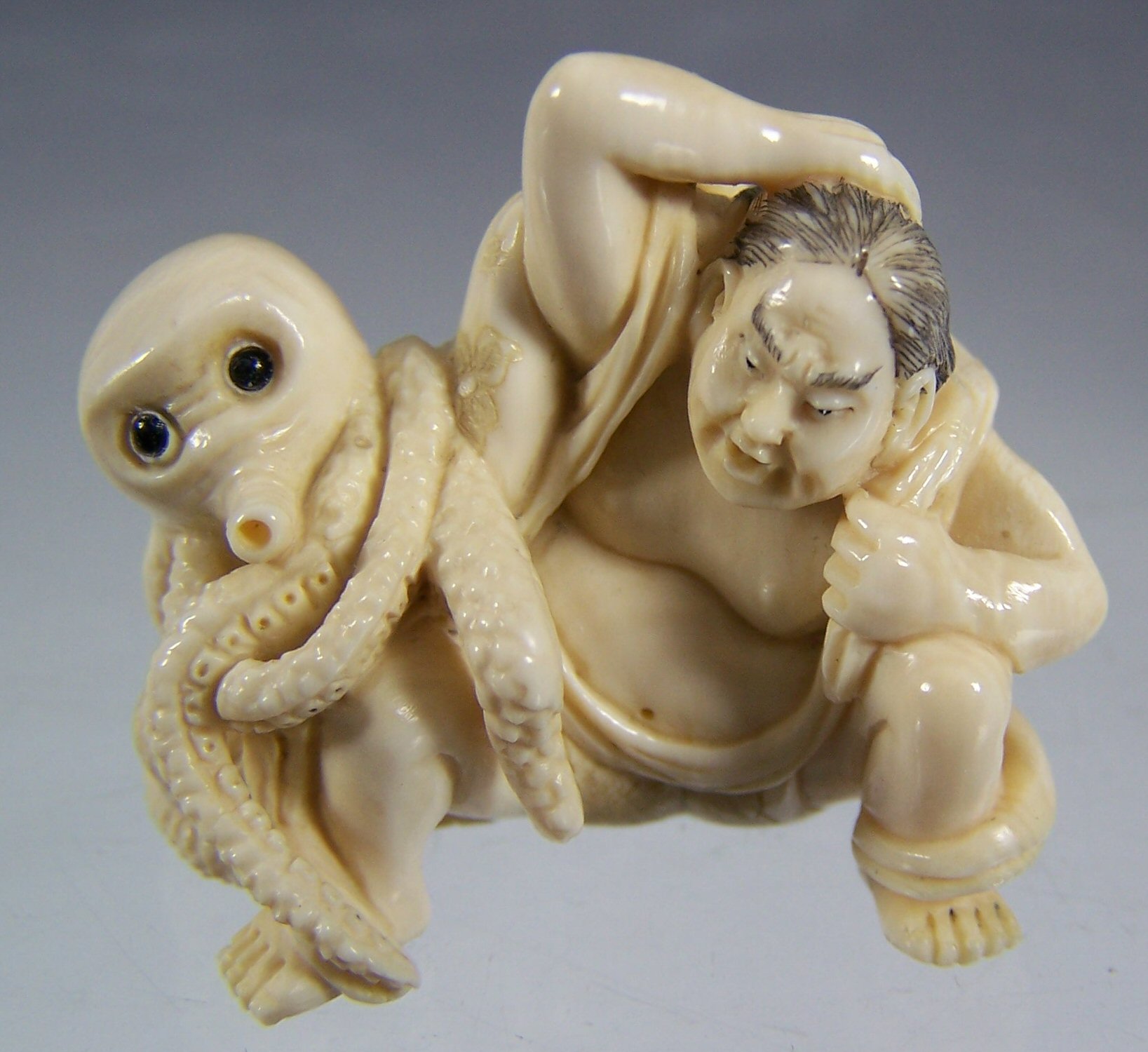A Japanese netsuke of a man with an octopus, Meiji period,