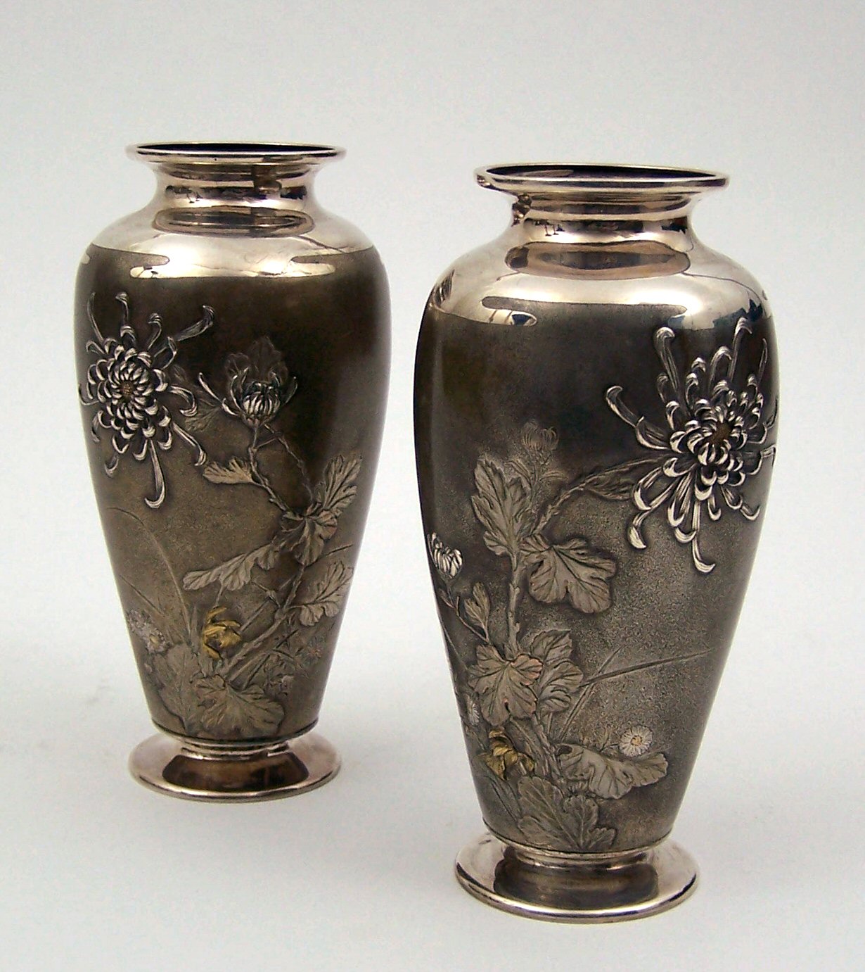 the body with cast chrysanthemums and foliage, with gold coloured highlights, on a gilt satin finished ground, signed (2)