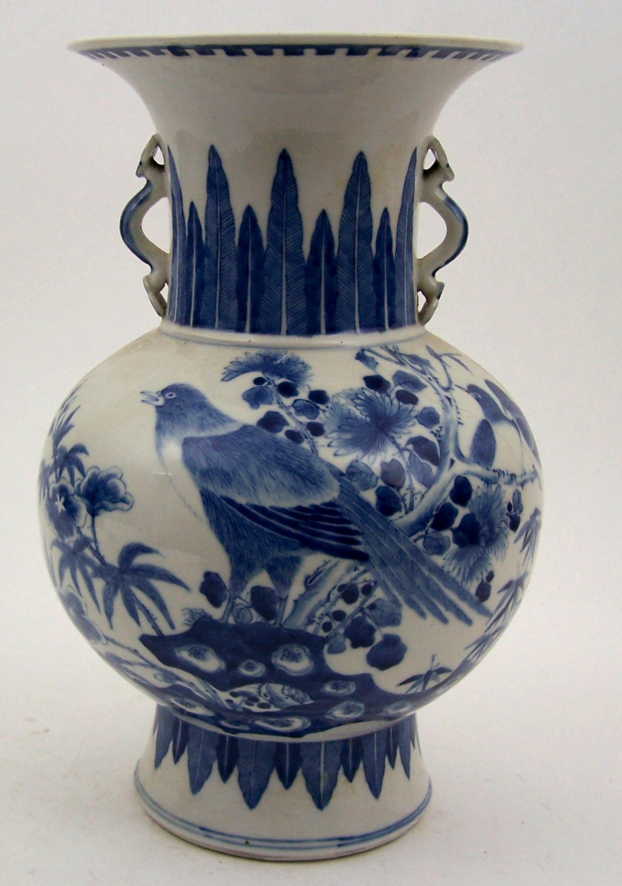 the flaring neck with stiff leaf decoration and two decorative handles, the onion shaped body decorated with birds and foliage, above foot with further stiff leaf decoration, blue painted character mark