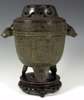with twin ox head handles, bands of geometric designs, on three feet, with pierced hardwood cover and stand