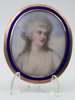 depicting a lady in a white dress within oval gold frame with blue enamel border and enclosed within red leather travel case