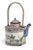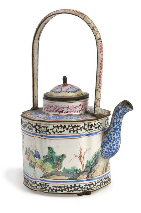 with arched handle above hexagonal form body, the cover decorated with a flowerhead, the handle, top and borders to the sides decorated with scrolling foliage in pink, blue and black, the body with continuous frieze of figures in a landscape (2)