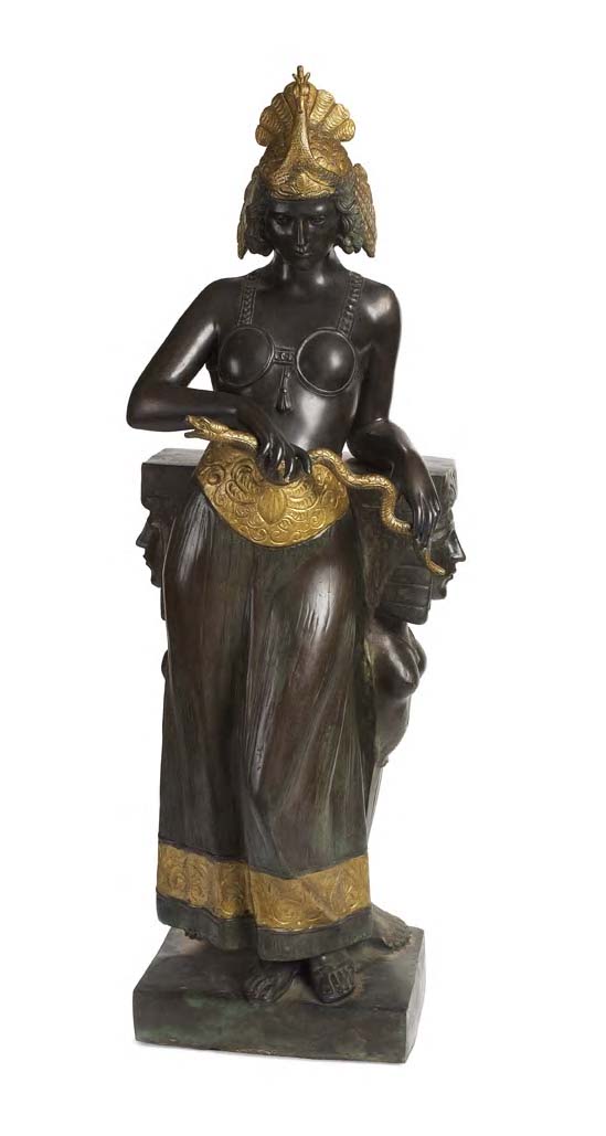 Bronze, partly gilded with verdigris patination, the semi-clothed figure with long skirt and peacock headress, holding a snake and leaning on a hermed pedestal, raised on associated stepped black marble plinth