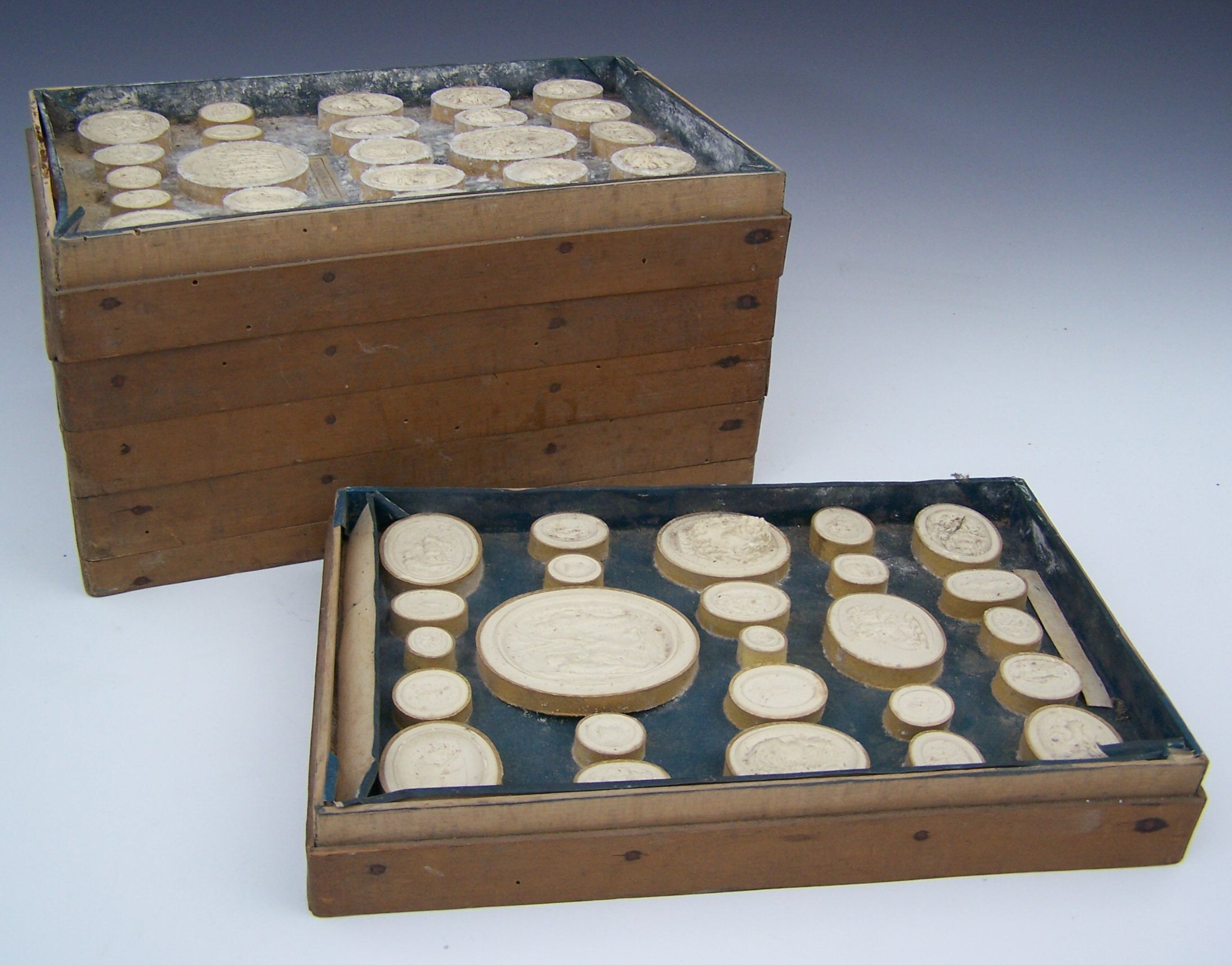 A 19th century boxed collection of plaster relief medallions of classical intaglios,