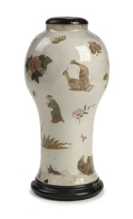 circa 1860, of baluster form, internally decorated with transfers in chinoiserie style against a cream ground, with ebonised wooden mounts (converted to a lamp base)