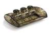 of bow-ended rectangular design with fitted divisions for three square glass inkwells with ebonised and foliate applied covers, the everted sides decorated with trailing foliage and volute scrolls, the centre with six flower head emblems