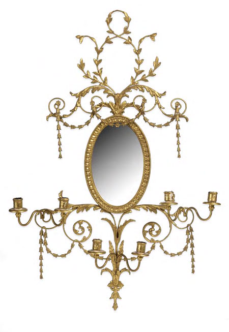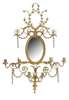 each with oval plates enclosed by leaf-moulded frames above three pairs of scrolling branches with turned nozzles supported by scrolling foliage and husk wags, the whole surmounted by elaborate leaf garlands and husk swags (2)