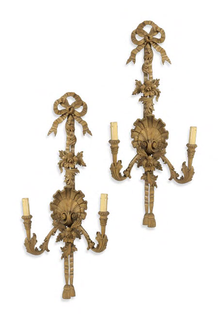 each with carved ribbon-tied back plate with central shell motif and exuberant flowering foliage, the twin leaf-carved scrolling branches with tapering nozzles and beaded and stiff leaf decoration (6)