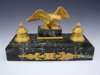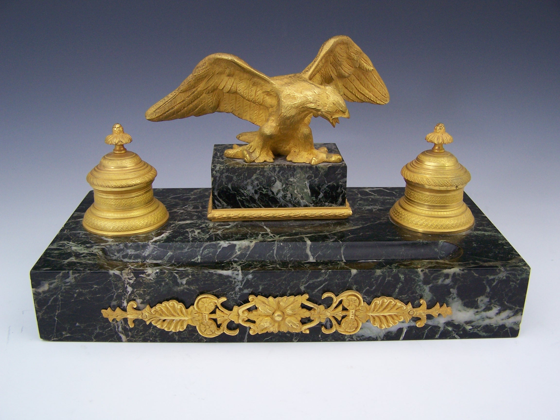 the rectangular Verde Antico marble base, with applied anthemion and foliate mount, surmounted by twin engine turned inkwells, each with glass liners, centred by the cast figure of an eagle raised on a plinth