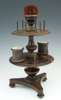 in the form of a dumb waiter, comprised of two graduated circular tiers with spindles for bobbins, surmounted by a plush-covered pin cushion, raised on baluster supports on a concave triform base with turned disc feet