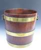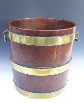 of staved cylindrical form, bound with three brass bands and with hinged carrying handles