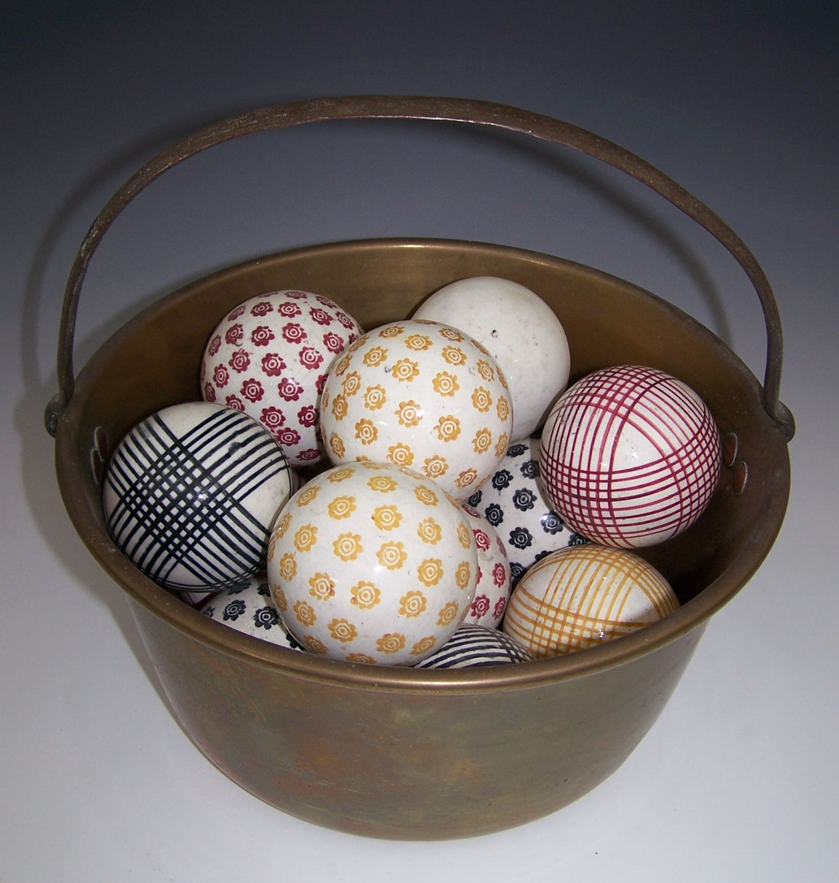 comprising six pairs, spongeware printed and a jack, within brass preserve pan (14)