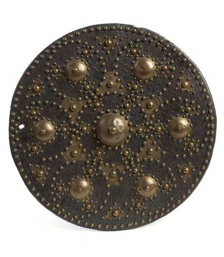of wood covered in decorated and embossed cowhide with brass headed nails and triangular section plates with a series of raised brass bosses, the back with original iron mounts, 49cm diameter; and another similar, modern, 50cm diameter (2)