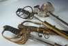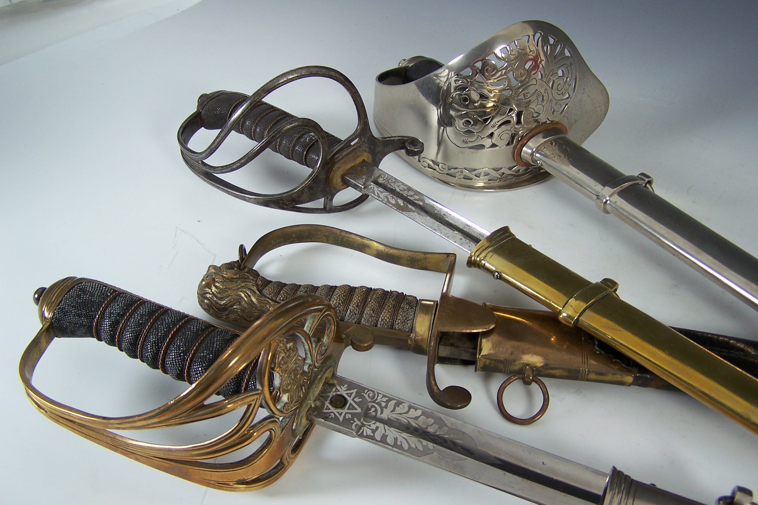 with gilt brass stirrup hilt with a lion head pommel with mane running down the back strap, the grip of fish skin bound with a double twist of brass wire, 30" blade, a brass hilted RAMC officer's sword with cypher of Edward VII on the hilt and VR etched on the single edged blade, an officer's sword with steel three bar bilt and a narrow single edged etched blade and a Staff Sergeant's sword and scabbard by Wilkinson (other scabbards associated) (4)