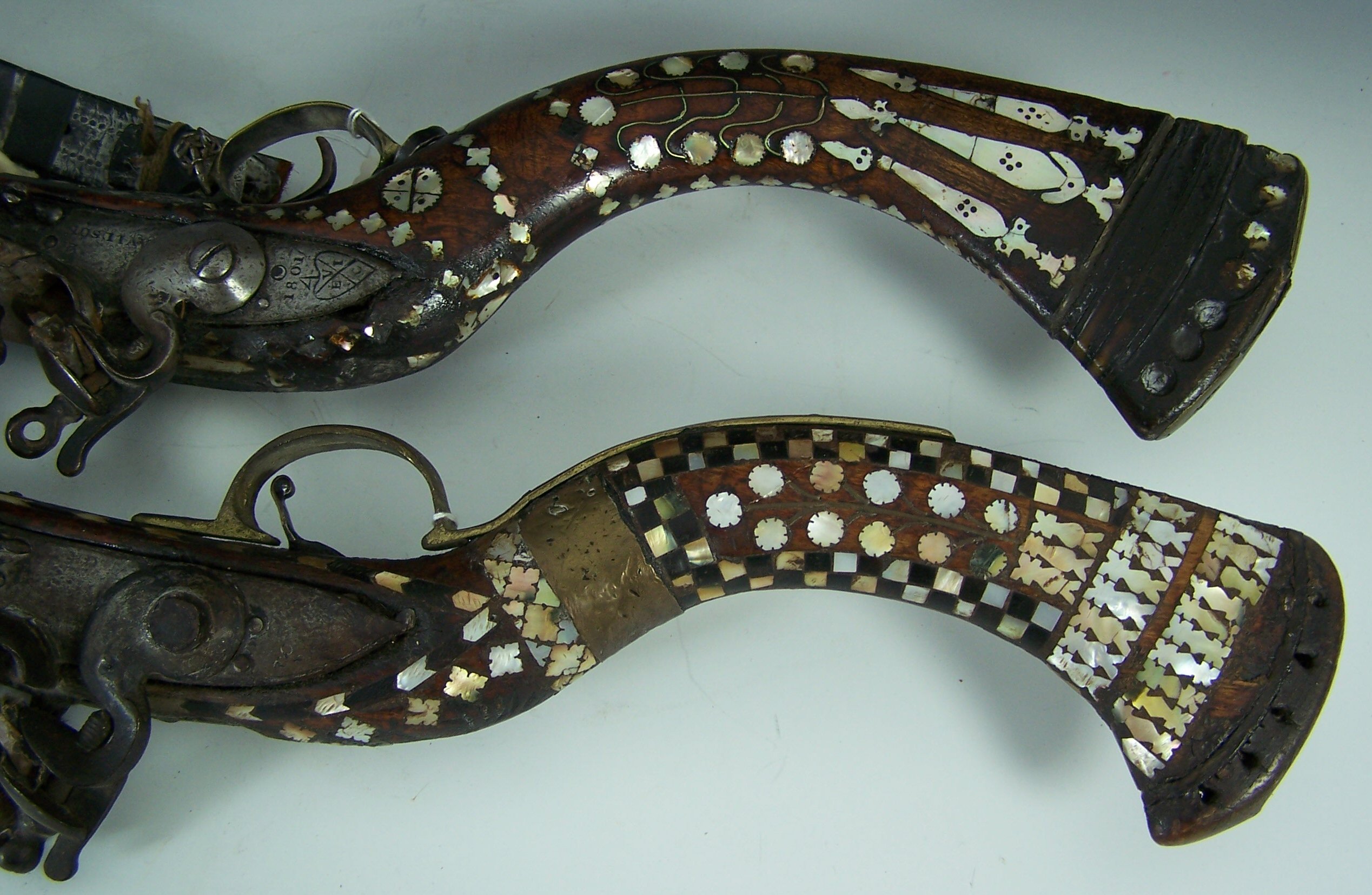 with traditional shaped stock inlayed with mother of pearl and British military locks, one dated 1801 United East India Company signed Davidson, with original steel ramrods and leather slings (2)