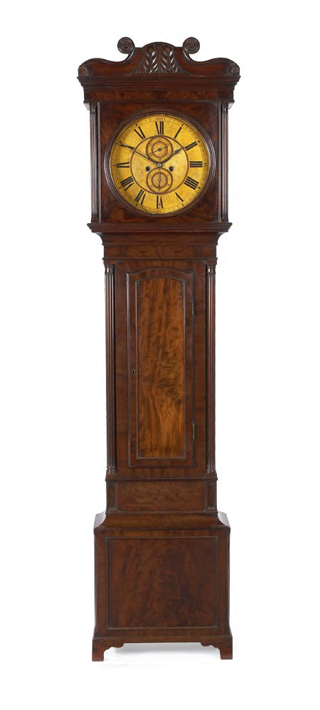 the twin train movement striking on a bell, the square hood with stiff leaf pediment enclosing a painted Roman circular dial with subsidiary seconds and calendar dials, the panelled and beaded case with full fluted columns, on bracket feet