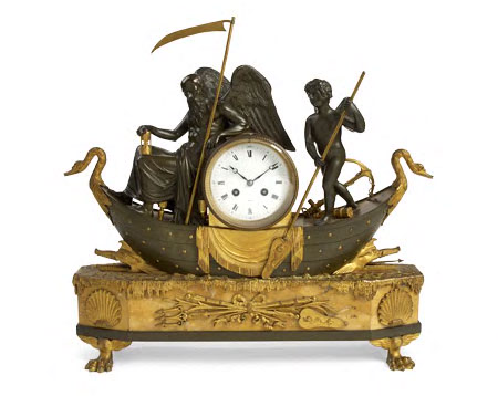 the twin train movement with circular enamel dial having Roman chapters, the elaborate case cast as a boat, carrying the figure of a winged father time and a putto holding an oar, the boat set with swags and raised on a marble plinth with applied nautical emblems and shells, the whole on winged paw feet