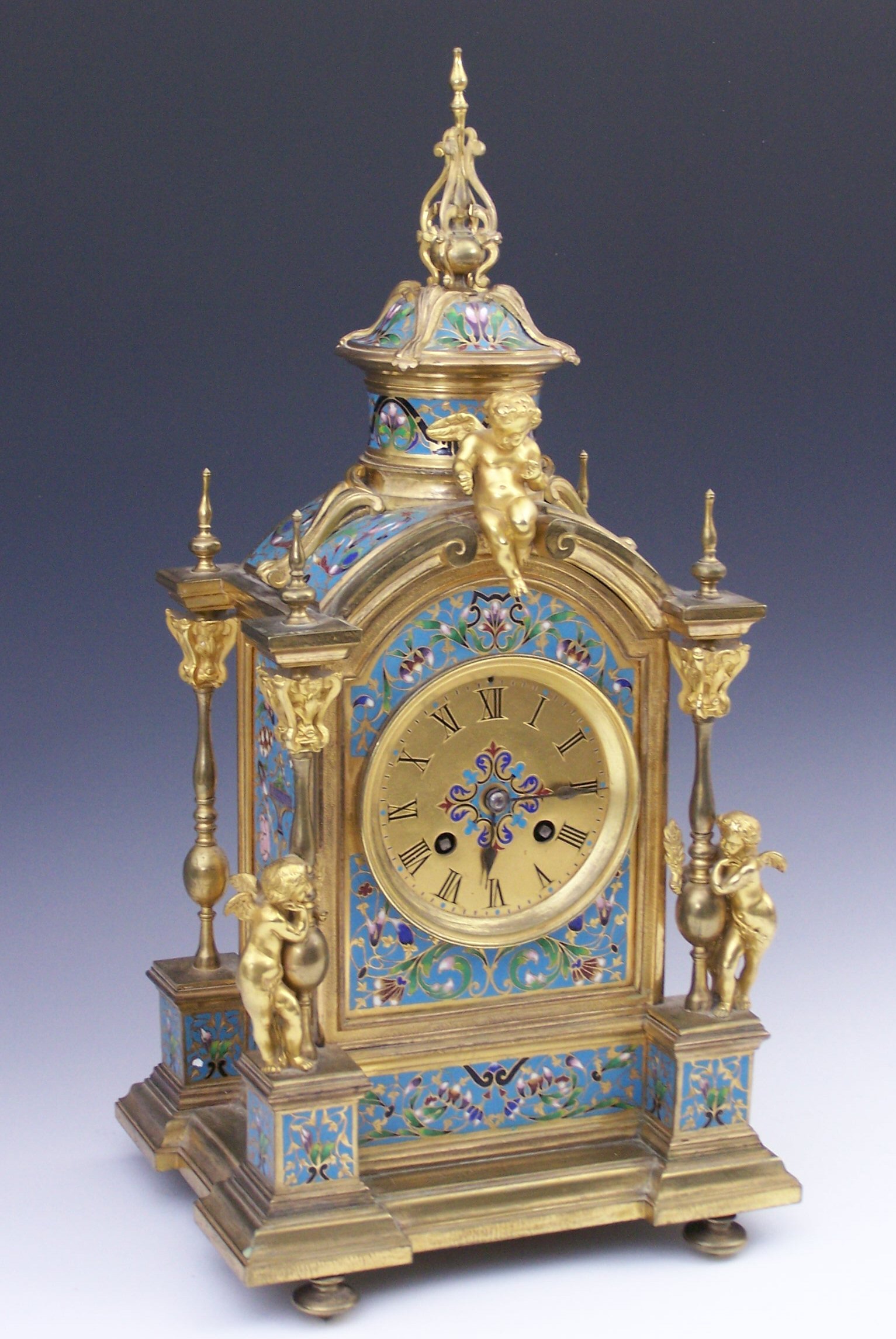 the Roman dial within an architectural case with four pillars and domed finial adorned with cherubs, on turned feet, the movement striking the hours and half hours on a bell, backplate stamped GV