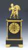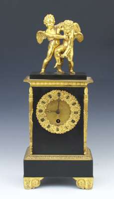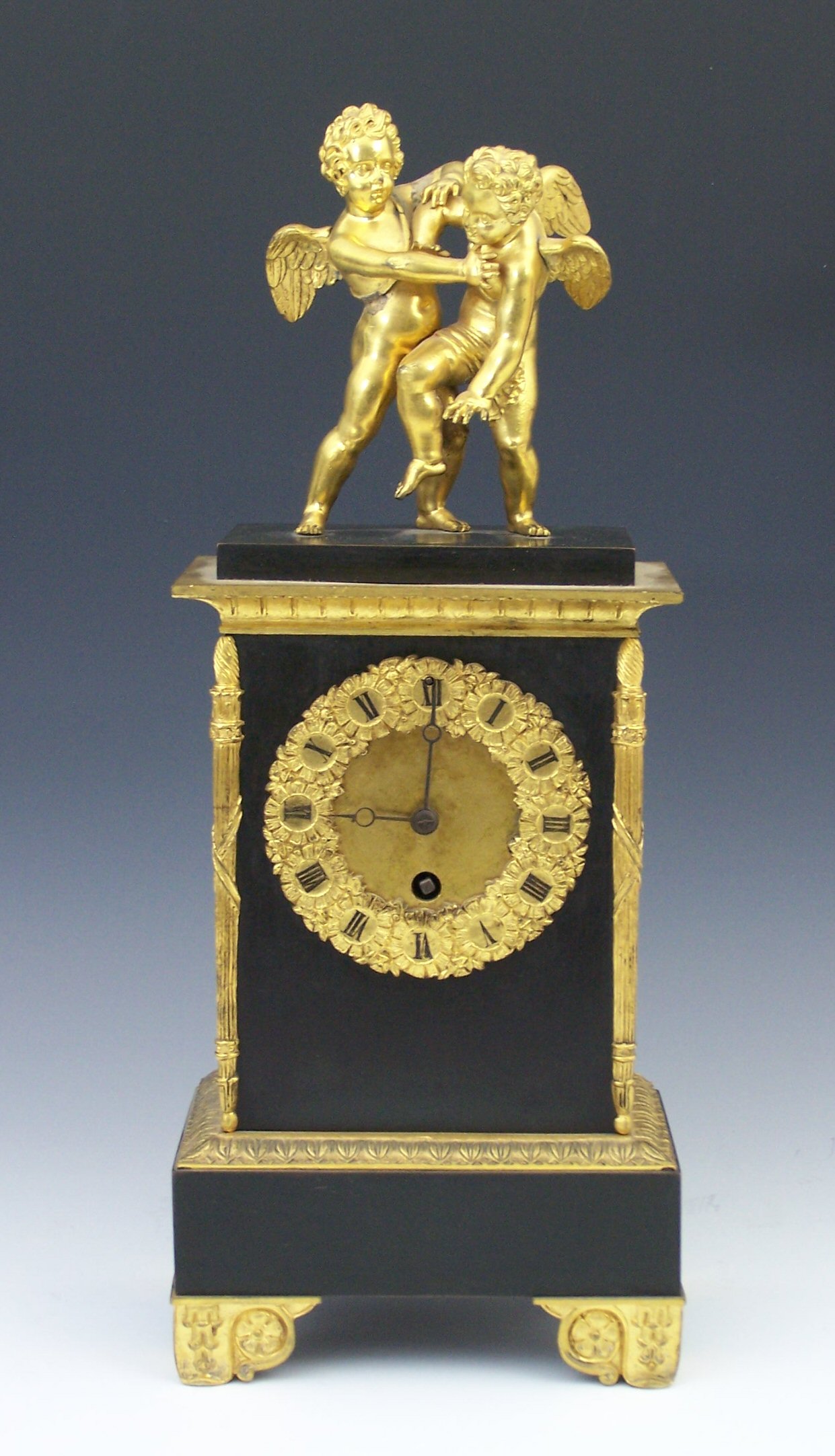 the rectangular case surmounted by two cavorting putti, the foliate cast Roman chapter ring between ribbon-tied pilasters, on volute-scroll cast bracket feet (lacking pendulum)