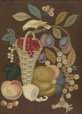 worked in coloured felts and threads with a still life of fruits with perched bird and butterfly, reserved on a brown felt ground, framed and gazed