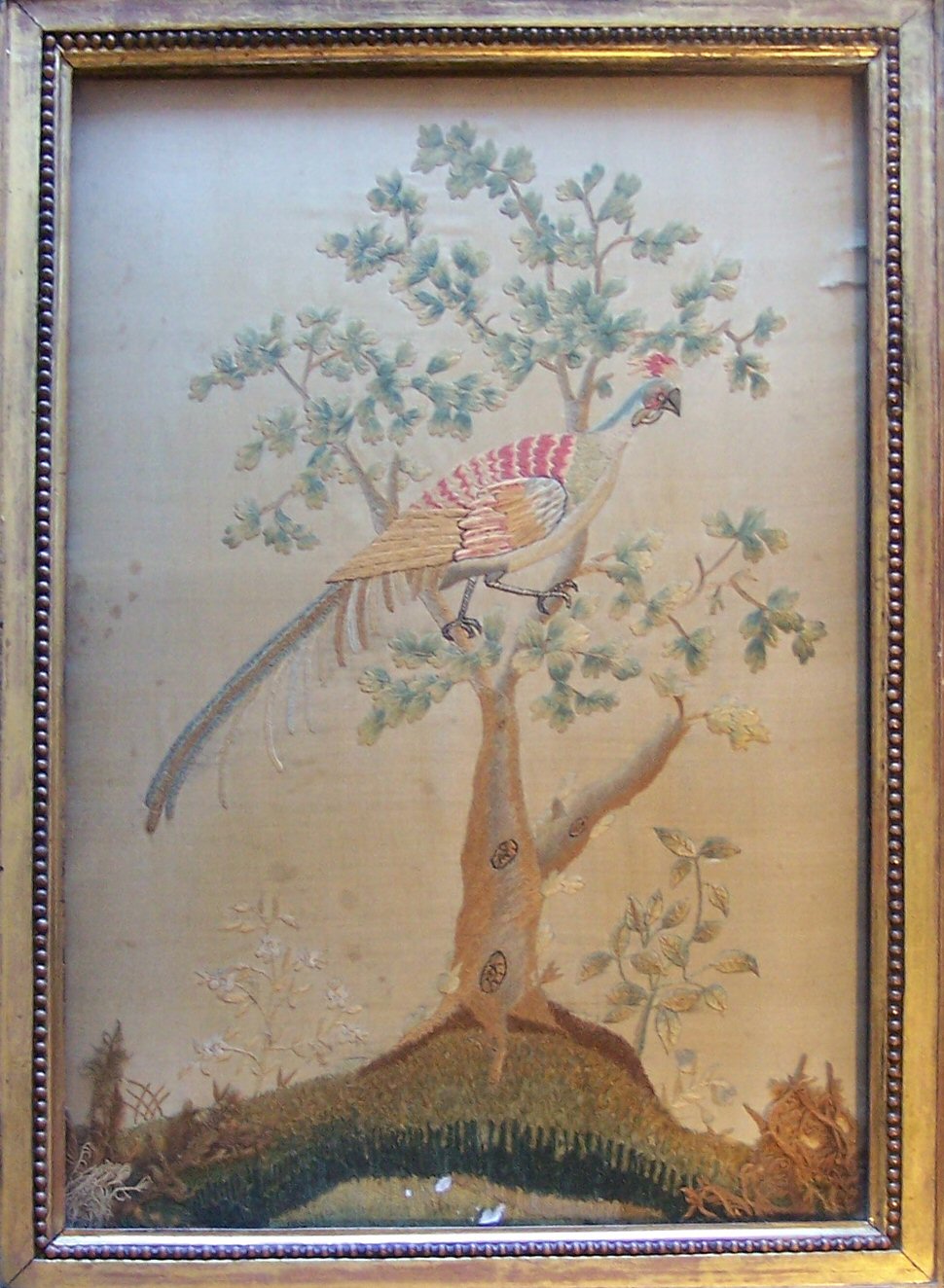 worked in coloured silks with an exotic pheasant, perched in a tree reserved on a silk ground, the whole within gilt frame