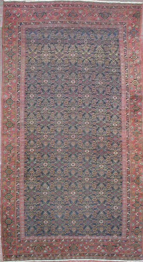 the indigo field with allover herati pattern, within red turtle palmette and scrolling vine border with inner red and indigo bands
