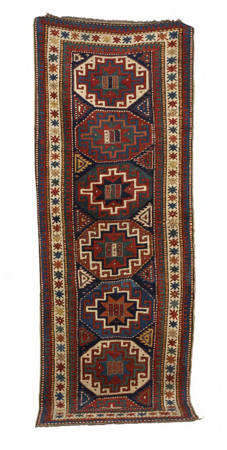 the indigo field with six polychrome hooked octagonal medallions, within ivory star border between skittle and stripe bands