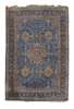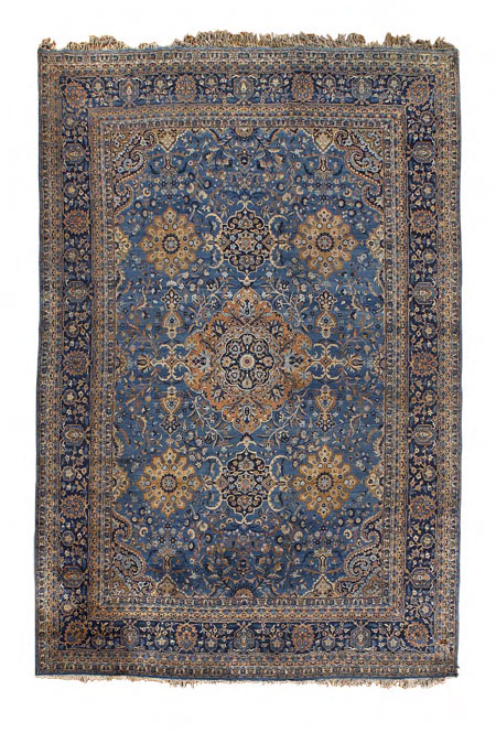 the blue field with central rust red and indigo medallion flanked on each side by three smaller indigo and brown medallions, indigo spandrels, within indigo palmette and floral vine border between rust red and cream bands