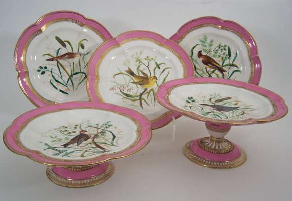 each with a pink and gilt scalloped border, the well painted with an ornithological specimen, comprising: a pair of tall footed comports; three shallow footed comports; and twelve dessert plates, gilt 'Ampersand' mark (17)