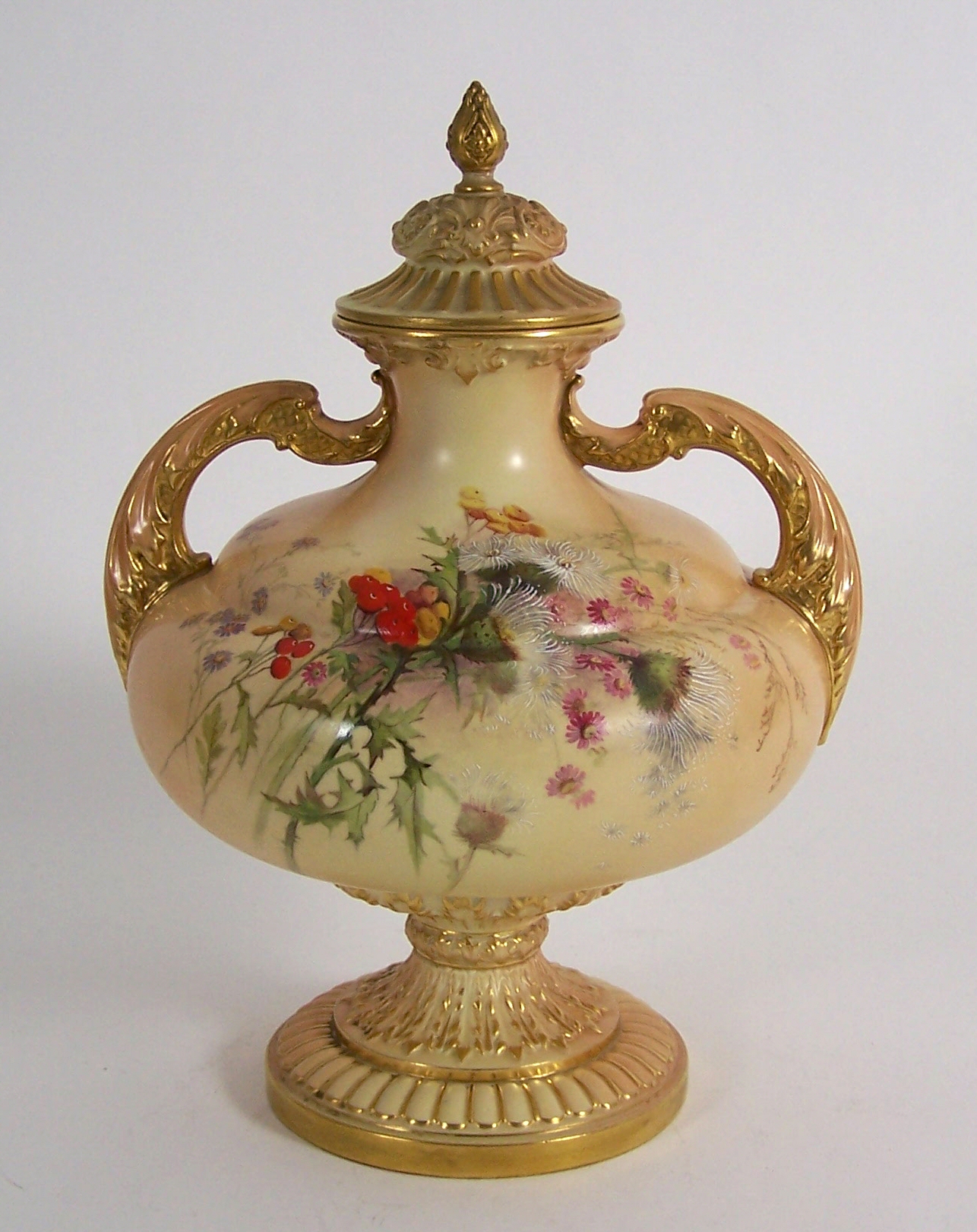 of squat baluster form, the cover with acorn finial above moulded scrolling foliage and gilt moulded line decoration, the body with twin scrolling handles, painted with flowers and foliage on a blush ivory ground above foot with stiff leaf foliage and gadrooned border, puce printed mark, date code for 1909 (2)