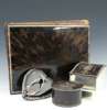 comprising an inkwell with sloping Neoclassical inlaid cover, 9ccm high, a similar circular box and cover, 9cm diameter, a heart shaped paper tidy with wish-bone shaped clasp, 10cm and a blotter with ribbon tied silver border, 29cm high (4)