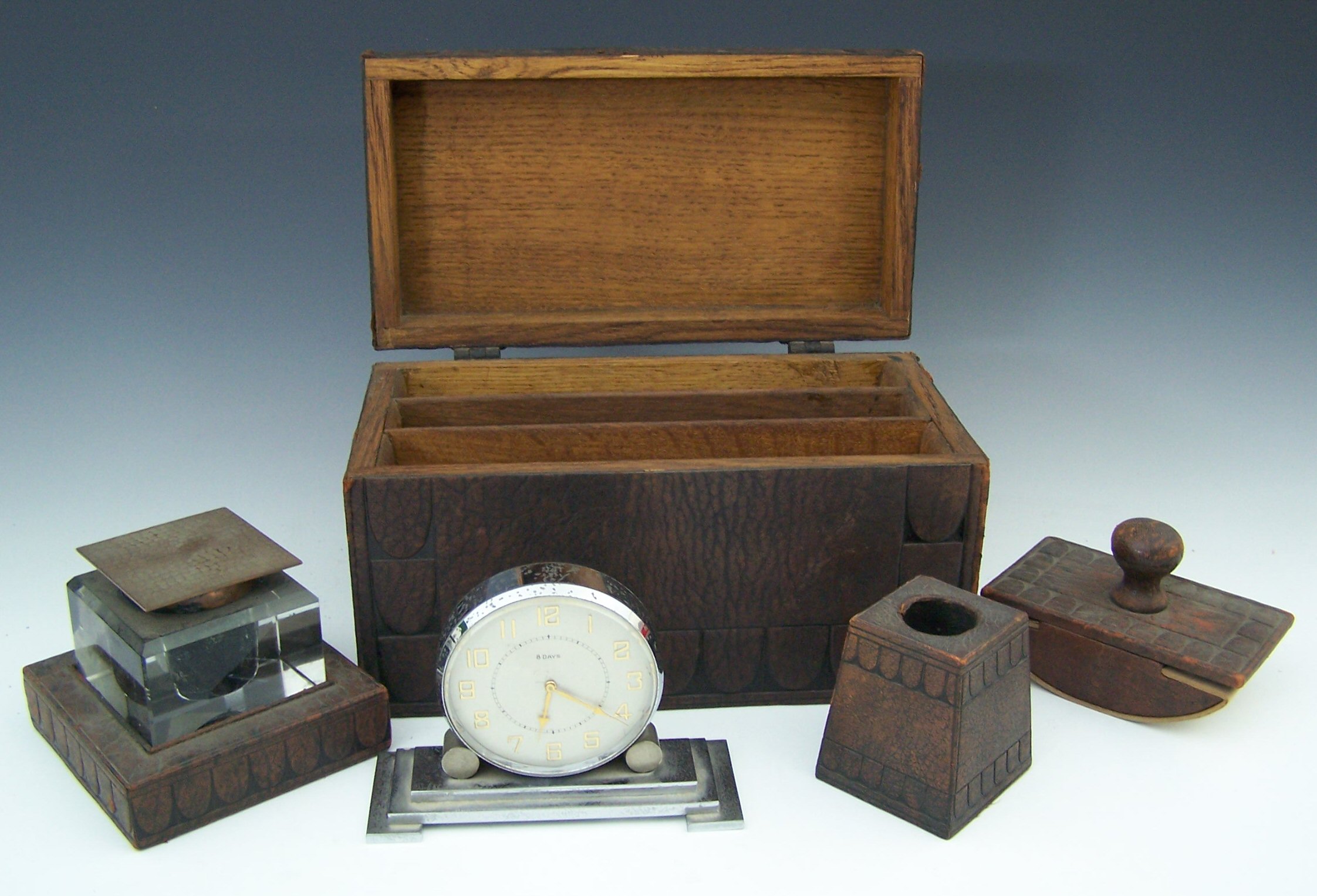 by J C Vickery, Regent St., London, comprising a stationery box, embossed with the initials W.M.S., a blotter pad, a hand blotter, all decorated with shield-shaped borders, together with an associated Art Deco chrome plated desk clock, with double sided circular Arabic dial, on stepped plinth base, 10cm high (6)