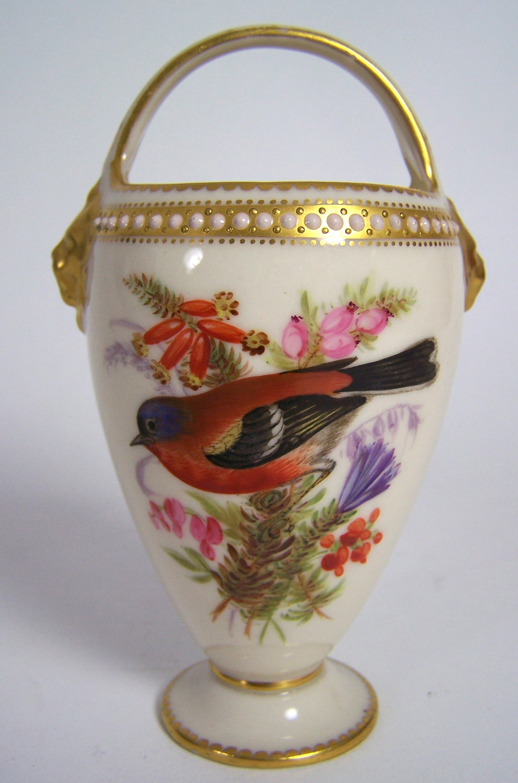 with loop handle terminating in gilt lions heads, the body with a row of white jewelling above opposed panels, each painted with a songbird amongst flowers and foliage, puce printed mark with date code for 1875