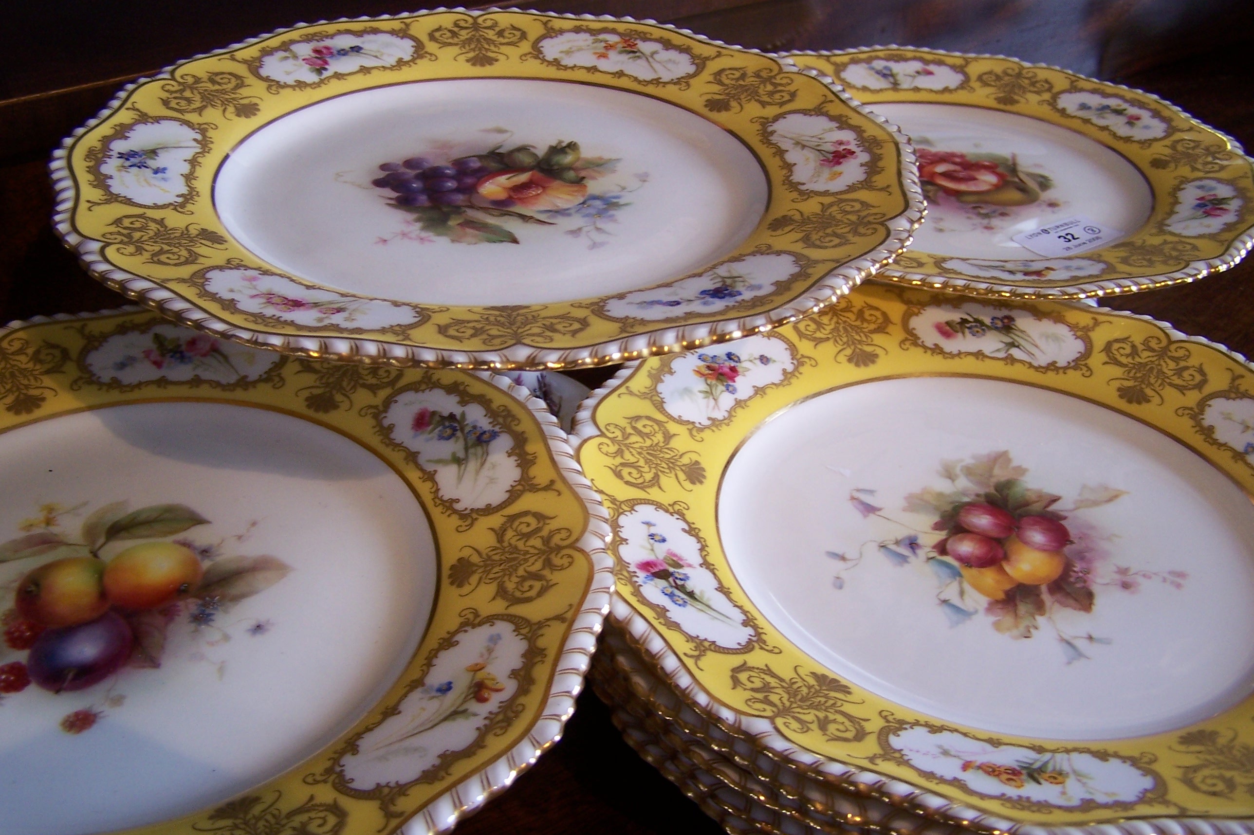 decorated with a scalloped rope twist border, a band of gilt swags on a bright yellow ground with cartouche panels containing flower sprigs, the well painted with fruit, comprising: a tall comport; two low comports; and five plates, puce printed mark and date code for 1909 (8)