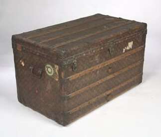 of rectangular form, covered with characteristic printed canvas, bound with tooled and studded leather straps to the angles and with studded wooden straps to the lid, enclosing a cotton-lined interior, with lift-out tray, bears paper label, serial no. 153105