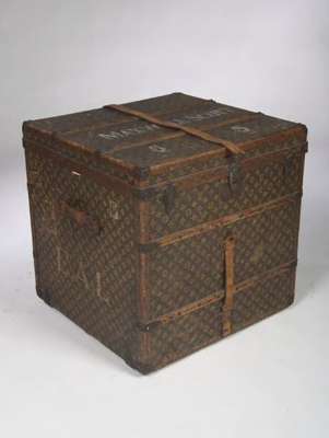 of rectangular form, covered with characteristic printed canvas, bound with tooled and studded straps to the angles and with studded wooden straps to the lid, enclosing a cotton-lined interior, with lift-out latticed tray, bears paper label, serial no 186047, the top later painted with inscription "Maxwell Scott/SS"