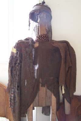 (all in corroded condition) on pine wood stands, one coat with crimson velvet collar decorated with brass headed beads, and armour arm guards, and two mail coats (6)