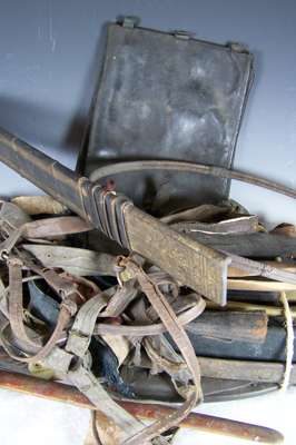 (in poor condition), together with two fencing foils, a plain leather military sabretache and three sword belts (qty)