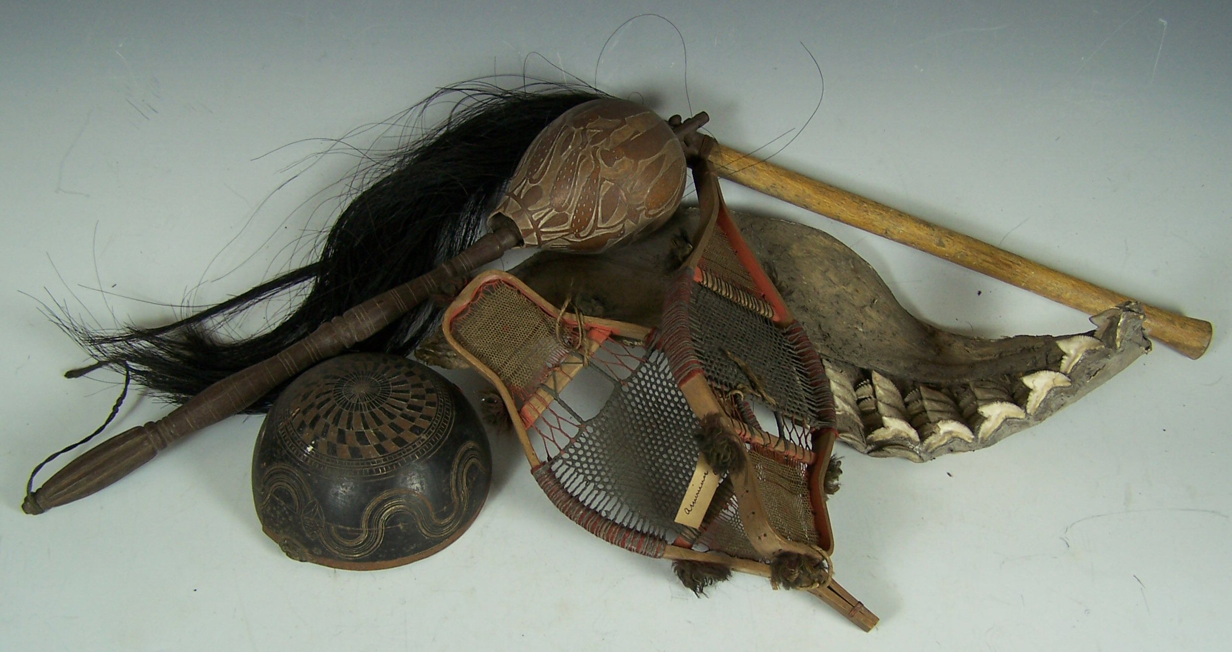 including; a pair of North American miniature snowshoes, sharks teeth in remains of skin , a furniture mount in the form of a knight in armour, a bamboo pipe with decorated shaft, a carved coconut half shell bowl (cracked) a hinged bronze stick handle with screw retainer, a Chinese brush holder sheath, two ivory fish harpoon tips, an iron servants bell pull lever, a broken (dated Nov 1820) measuring stick, a tortoise shell scabbard with a short bladed knife, a carved gourd rattle and a large belt buckle (qty)