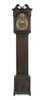 the twin train movement with anchor escapement striking on a bell, the arched brass dial with silvered chapter ring and rococo spandrels and with subsiduary seconds dial and date aperture, the arched trunk door above plain base on shaped bracket feet