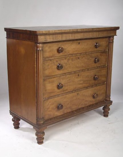 the rectangular top above plain frieze and four long graduated drawers, enclosed by reeded half columns and raised on turned supports