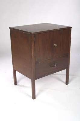 the hinged bowfront top with moulded edge above twin doors, all opening to reveal an interior fitted with china bowl and turned cover, the whole raised on square legs, 54cm wide, 75cm high, 45cm deep, also another George III mahogany bedside commode of similar design