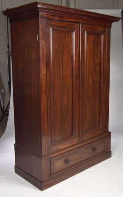 the moulded and projecting cornice above two panelled doors enclosing a fitted interior above a panelled lower drawer, raised on a plinth
