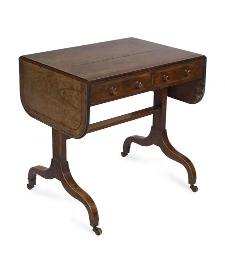with ebony and boxwood stringing, the rectangular top with rounded angles above two opposed frieze and dummy drawers raised on rectangular section supports linked by a stretcher and raised on square curved legs with brass caps and castors